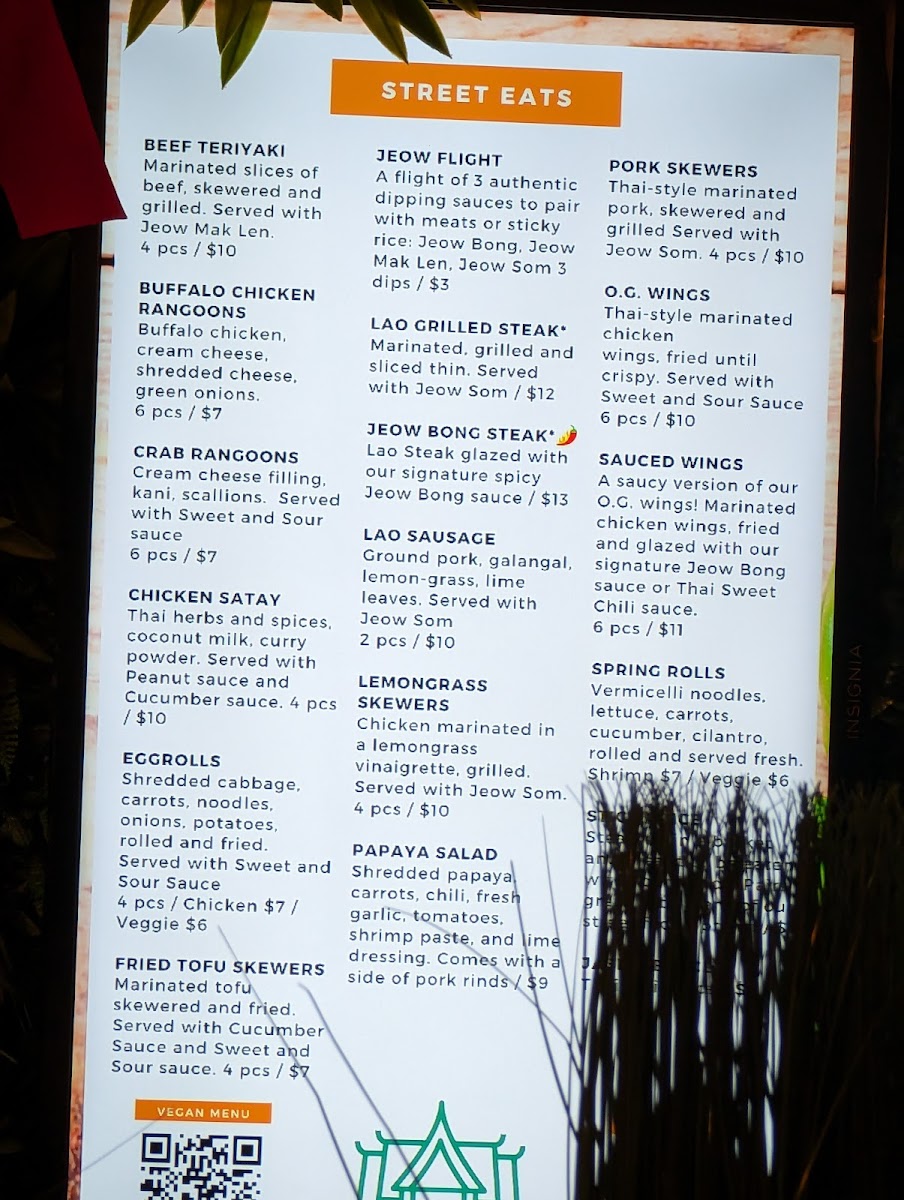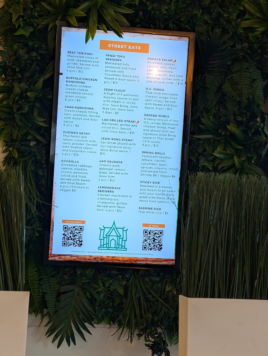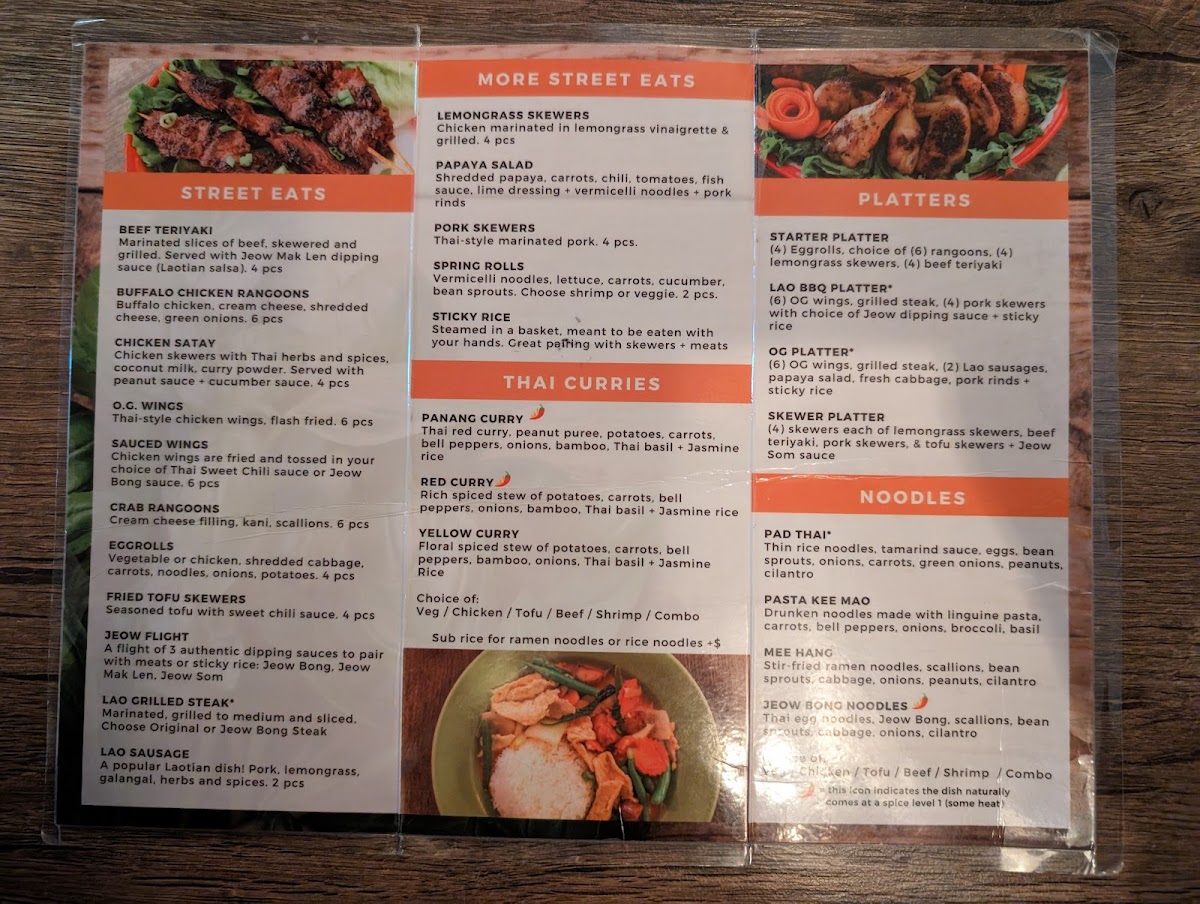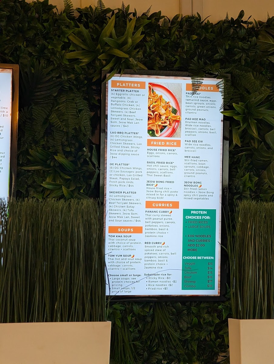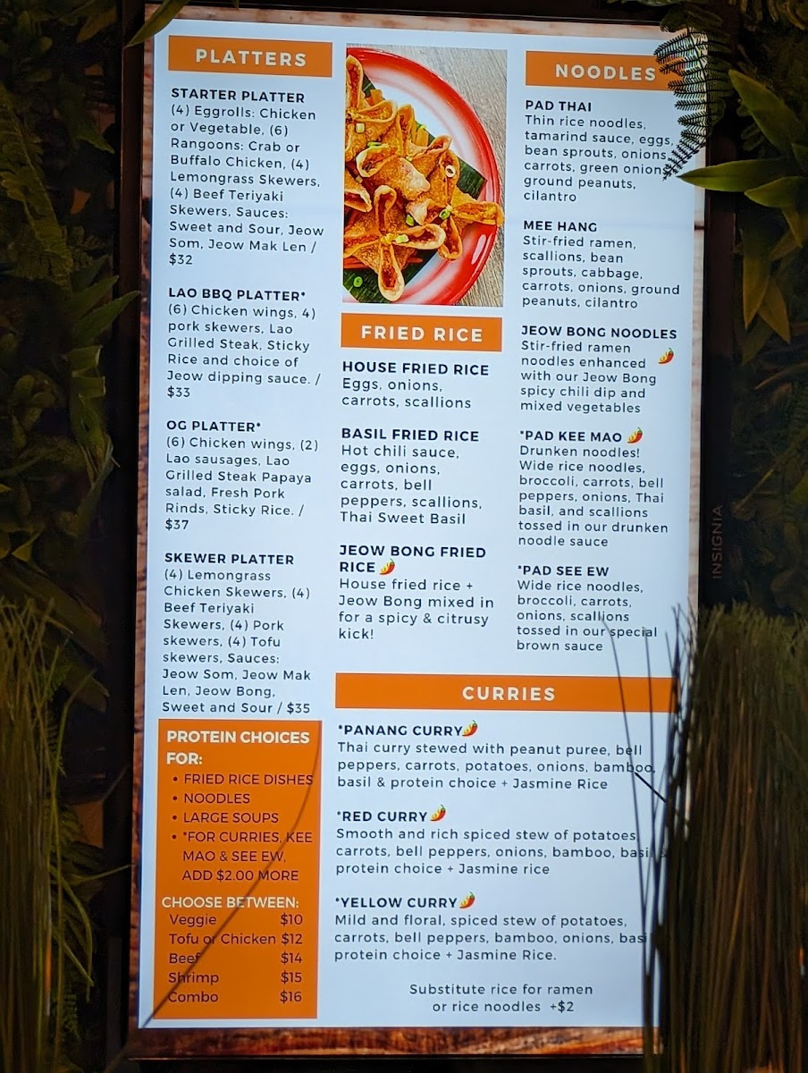 You’ll find a variety of flavorful options like Crab Rangoon, Basil Fried Rice, and Beef Skewers alongside rich soups such as Tom Kha and Tom Yum. Noodles are a highlight here, with classics like Pad Thai and Pad See Ew often enjoyed during lunch or dinner when you want something hearty but not heavy. The menu also features shareable platters like the Lao BBQ Platter and Og Platter, perfect for casual group meals or when you want to explore different tastes in one sitting.